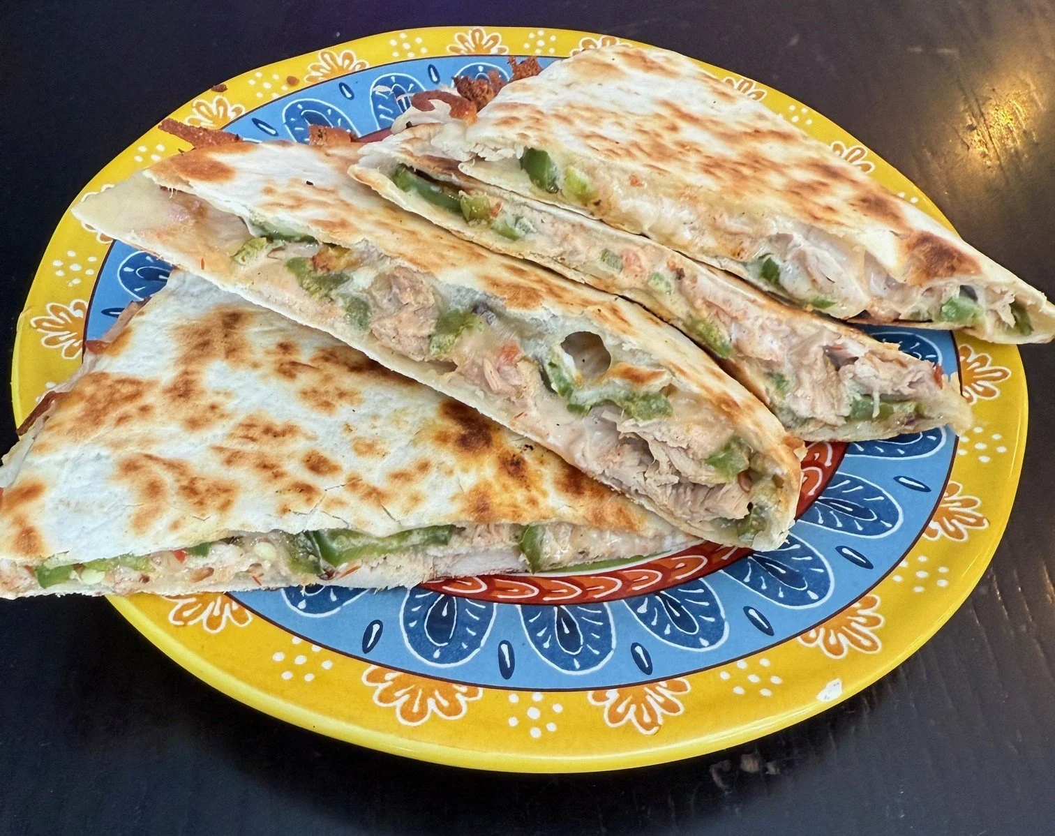 12” toasted quesadilla filled with melted pepper jack cheese, pulled chicken, grilled jalapenos, and a creamy sweet & tangy sauce.
